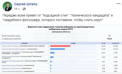 После того, как ЦИК подсчитал 100% бюллетеней, Штепа написал: "Передаю всем привет от "подсадной утки", "технического кандидата" и "свадебного фотографа, которого поставили, чтобы слить округ" и прикрепил скрин с результатами голосования 21 июля.