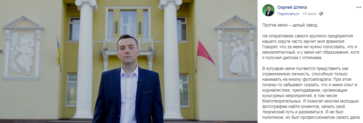 Также Сергей Штепа писал в Facebook, что в кулуарах самого крупного завода округа, то есть "Мотор Сичи", к которому имеет отношение его главный оппонент, работникам говорили не голосовать за него "представляя, как ограниченную личность, способную только нажимать на кнопку фотоаппарата". И напоминал, что в числе его заслуг - опыт в журналистике, преподавании, организации культурных мероприятий, в том числе благотворительных.