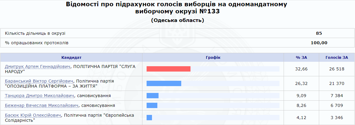 На внеочередных выборах в Верховную Раду по 133 округу в Одесской области победил представитель партии "Слуга народа" мастер спорта международного класса по пауэрлифтингу 26-летний Артем Дмитрук. Об этом свидетельствуют данные ЦИК