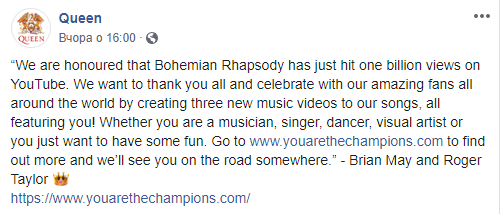 "Для нас большая честь, что Bohemian Rhapsody достигла миллиарда просмотров на YouТube. Мы хотим поблагодарить вас всех и отблагодарить, пригласив к участию в создании трех новых музыкальных видео к нашим песням. Независимо от того, музыкант вы, певец, танцор, художник или вы просто хотите немного веселья - переходите по ссылке www.youarethechampions.com, чтобы узнать больше", - говорится в сообщении.