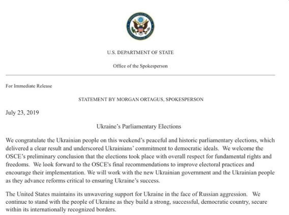 Государственный департамент США поздравил украинский народ с мирным проведением исторических парламентских выборов, которые "дали четкий результат и подчеркнули приверженность украинцев идеалам демократии".