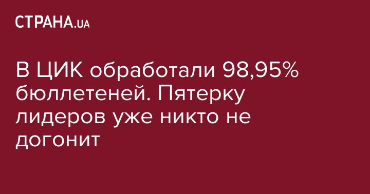 По состоянию на 06:50, 24 июля, Центральная избирательная комиссия обработала 98,95% протоколов внеочередных парламентских выборов. В лидерах "Слуга народа" и "Оппозиционная платформа", на третьем месте "Батькивщина", незначительно опережающая "Европейскую солидарность".