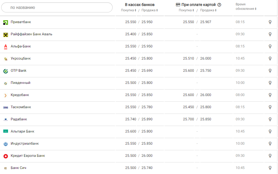 В банках курс доллара к 11:00 находится в коридоре 25,4-25,6 грн - покупка и 25,69-25,95 - продажа - в зависимости от разных банков. К этому времени банки выставили такие курсы в кассах: Приватбанк - 25.550/25.950, Райффайзен Банк Аваль - 25.400/25.850, Укрсоцбанк - 25.450/25.800, Альфа-Банк - 25.550/25.950, Пумб - 25.500/25.900, Ощадбанк - 25.500/26.120, Укргазбанк - 25.500/26.000, Укрэксимбанк - 25.500/25.990, ОТР банк - 25.450/25.690, Укрсиббанк - 25.450/25.950, А-банк - 25.400/25.700.
