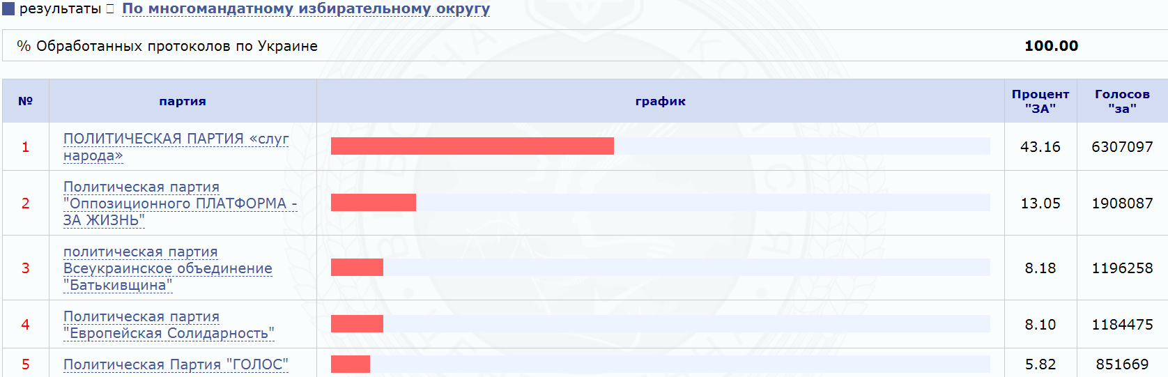 ЦИК подсчитала 100% голосов. На первом месте - "Слуга народа", у партии 43,16%. Второе место заняла "Оппоплатформа-За Жизнь" с 13,05%. "Батькивщина" занимает третье место (8,18%), обойдя в процессе подсчета "Европейскую солидарность" (четвертое место и 8,10%). Замыкает пятерку проходных политсил "Голос", у него 5,82%. Остальные партии не набрали более 5%, что было необходимым условием для прохождения в Верховную Раду.