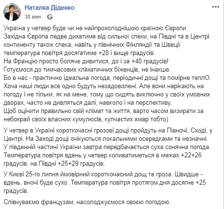 "На Францию просто больно смотреть, до и за +40 градусов! Готовимся к временным климатическим беженцам, не иначе. Потому что у нас - практически идеальная погода, периодические дожди и умеренное тепло. Хотя наши люди все равно будут недовольны. Но они жалуются на погоду и не только, на мой взгляд, потому что сидят исключительно в своих условных дворах, часто не смотрят дальше, вокруг и на перспективу", - написала Наталья Диденко.