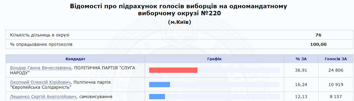 Отметим, по результатам подсчета 100% протоколов, Сергей Лещенко занял третье место на избирательном округе №220, от которого баллотировался как самовыдвиженец, набрал он 12,13%. Его с 16,24% обошел кандидат от "Евросолидарности" Алексей Окопный. Победу же одержала кандидат от "Слуги народа" Анна Бондар, за нее проголосовало 36,91% избирателей.