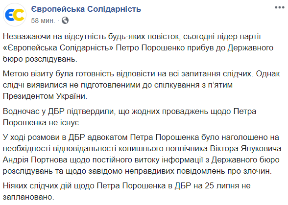 "Несмотря на отсутствие каких-либо повесток, сегодня лидер партии "Европейская Солидарность" Петр Порошенко прибыл в Государственное бюро расследований.