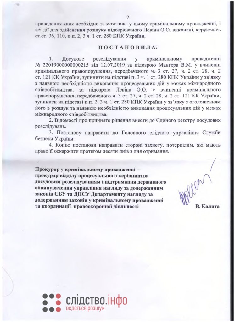 Как свидетельствует документ, ГПУ остановила следствие по главным фигурантам дела Гандзюк еще 16 июля. Генпрокуратура объединила подозреваемых в одно производство и остановила его потому, что Алексей Левин находится в розыске. Дескать, с ним пока нет возможности проводить следственные действия в Украине.