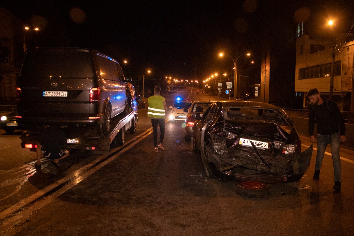 Авария случилась около 22:00. Двигаясь по направлению в сторону метро "Почайная" водитель Volkswagen переезжал мост и по неизвестной причине не заметил, что на спуске с путепровода идет оформление ДТП. Остановиться Transporter смог только влетев в Hyundai. В аварии никто сильно не пострадал. От удара у Hyundai вмяло в салон багажник.