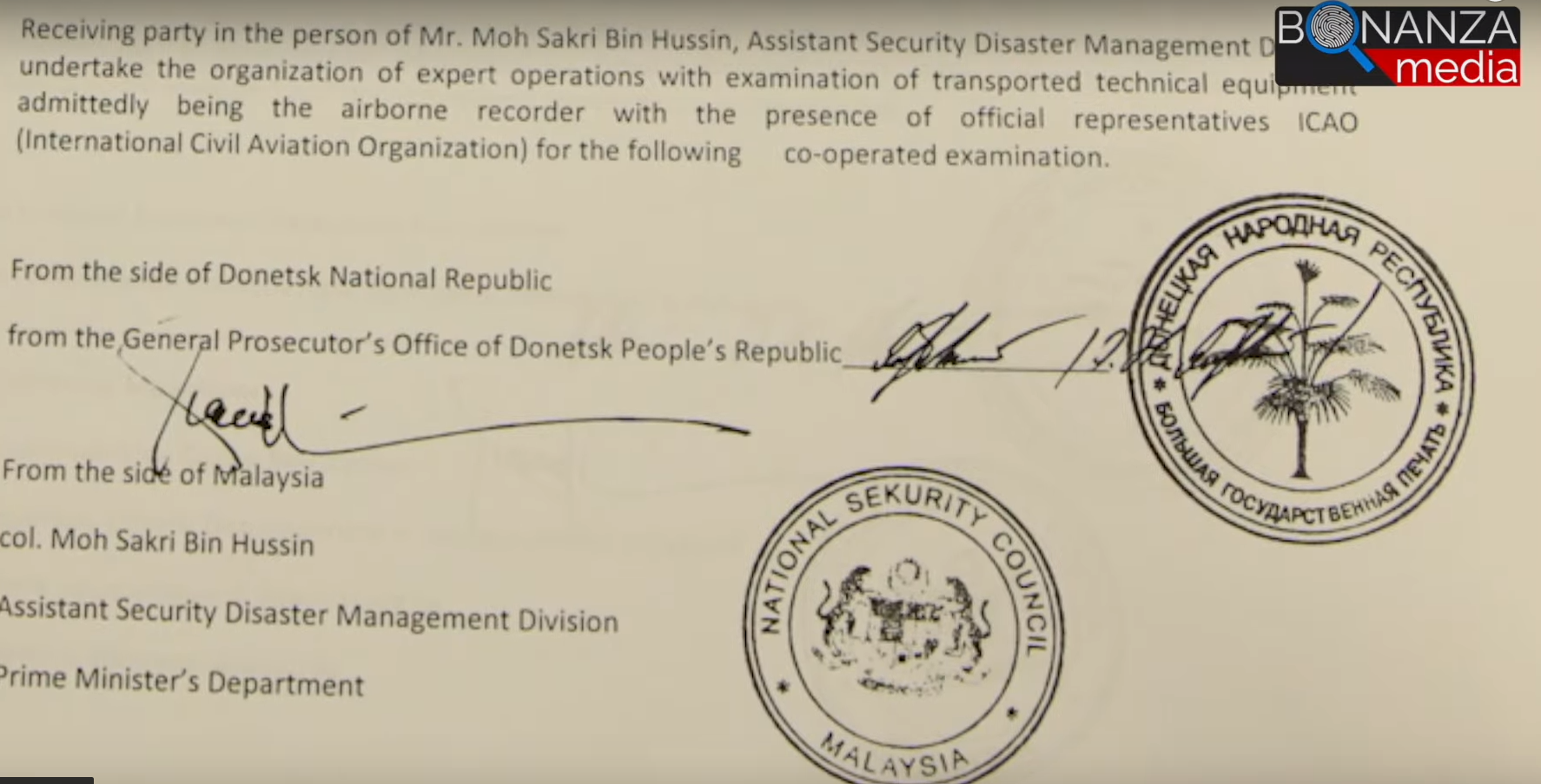 В  фильме также показан документ с подписью Сакри и Бородая и печатью Национального совета безопасности Малайзии, в котором закреплен факт передачи "черных ящиков".