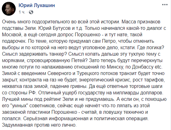 "Очень много подозрительного во всей этой истории. Масса признаков подставы Зели. Юрий Бутусов и т.д. Только начинался какой-то диалог с Москвой, а ещё сегодня допрос Порошенко - и тут нате, такой подарочек. По теме, которую придумал сам Петро, чтобы отменить выборы и по которой на него ведут уголовное дело, кстати.