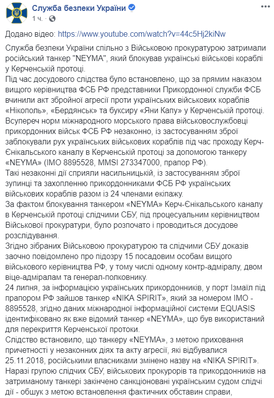 Танкер NEYMA задержали в порту Измаил Одесской области, куда он вошел 24 июля, сообщает СБУ. Именно он, по данным спецслужбы, блокировал Керченский пролив 25 ноября, когда укранские военные корабли хотели его пересечь.
