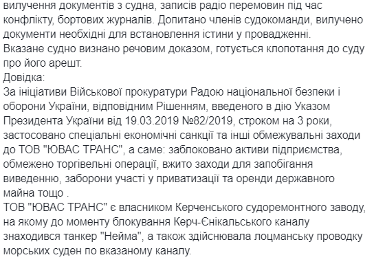 Следствием установлено, что танкер "NEYMA", с целью сокрытия причастности к незаконным действиям и акту агрессии, который происходил 25.11.2018, российскими владельцами переименован на "NIKA SPIRIT"", - заявляют в военной прокуратуре.