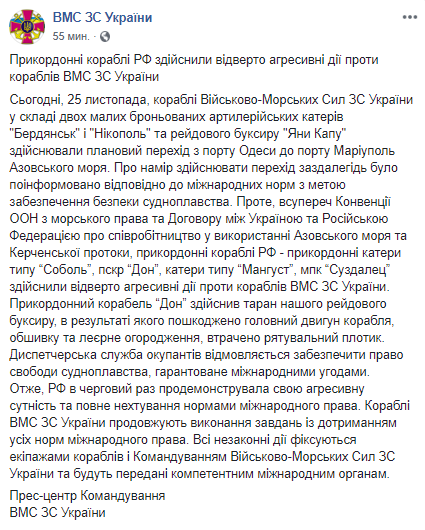 В то время, как в сообщении ВМС Украины от 25 ноября (скриншот приведен ниже) указанный танкер вообще не фигурирует как участник инцидента.