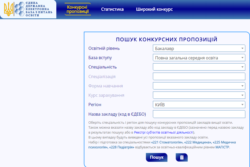 В открывшемся шаблоне нужно внести данные о специальности и городе/области в которых находится вуз. Например, "журналистика" или "право", а город "Киев", "Харьков" (в зависимости от того, в какой вуз и на какую специальность абитуриент подавал заявление). Далее следует нажать на синий блок "Пошук", и выбрать в списке интересующий вуз и "Список поступающих". В прошлом году списки рекомендованных на бюджет появились в течение рабочего дня, выглядело это вот так: