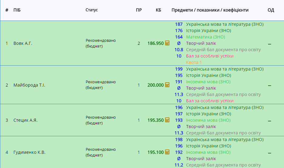 Рейтинговые списки всех подавших заявки можно смотреть на сайте Вступ. Освiта.ua, выбрав нужный регион, вуз и специальность. Там отображается информация о всех абитуриентах: их конкурсные баллы, результаты экзаменов и сертификатов ВНО.