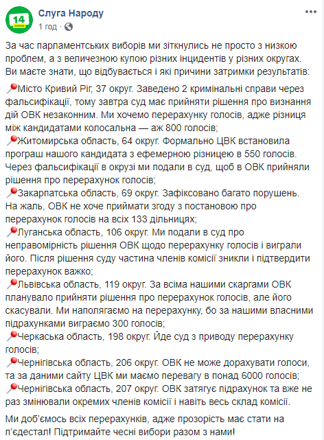 "Мы добьемся всех пересчётов, ведь прозрачность должна стать на пьедестал! Поддержите честные выборы вместе с нами!", - подчеркнули в "Слуге народа".
