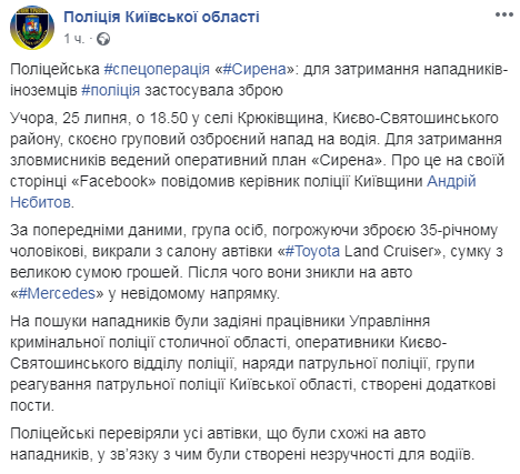 В селе Крюковка Киевской области граждане Грузии напали на водителя автомобиля и похитили сумку с крупной суммой денег. Об этом в Facebook сообщает отдел коммуникации областной полиции в пятницу, 26 июля.