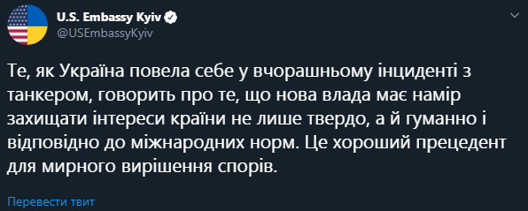 "То, как Украина повела себя во вчерашнем инциденте с танкером, говорит о том, что новая власть намерена защищать интересы страны не только твердо, но и гуманно и в соответствии с международными нормами. Это хороший прецедент для мирного разрешения споров", - сказано в сообщении.