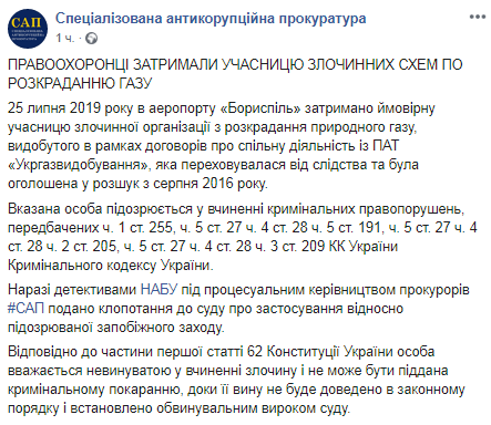 Как сообщает в Facebook пресс-служба САП, сотрудники Специализированной антикоррупционной прокуратуры задержали предполагаемую участницу преступной организации по разворовыванию природного газа, добытого в рамках договоров о совместной деятельности с ОАО "Укргазвидобування", которая скрывалась от следствия и была объявлена в розыск с августа 2016 года.