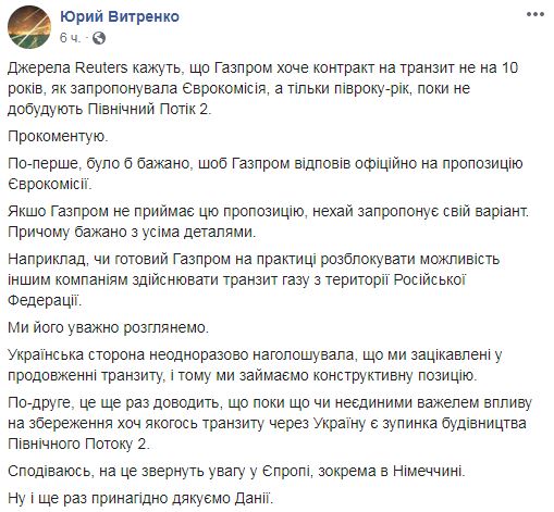Также он считает, что эта информация "еще раз доказывает, что пока что единственным рычагом влияния на сохранение хоть какого транзита через Украину является остановка строительства Северного потока 2", - сообщил Витренко. Он надеется, что "на это обратят внимание в Европе, в частности в Германии" и поблагодарил Данию.