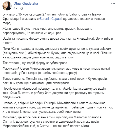 В ночь с пятницы на субботу, 27 июля, в Ивано-Франковской области случилось ДТП: пьяный водитель врезался в автомобиль волонтера Евгении Серой, травмы получили три человека. Об этом в Facebook сообщила журналистка Ольга Худецкая.