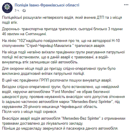 Инцидент произошел около 03:15 поблизости села Заболотово. По данным полиции, управляя автомобилем "Ford Mondeo", водитель не выбрал безопасную скорость движения, проявил невнимательность в результате чего допустил столкновение с задней частью автомобиля марки "Mersedes-Benz Sprinter" под управлением 20-летнего жителя Черновицкой области.