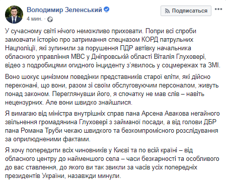 "... Видео с подробностями отвратительного инцидента появилось в соцсетях и СМИ... Просмотрев его, я сначала не имел слов – даже нецензурных. Но они быстро нашлись. Я требую от министра внутренних дел господина Арсена Авакова немедленного освобождения гражданина Глуховери от занимаемой должности, а от головы ГБР господина Романа Трубы жду быстрого и бескомпромиссного расследования по обнародованным фактам", – написал Владимир Зеленский.
