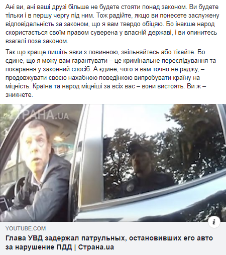 "Ни вы, ни ваши друзья больше не будете стоять над законом. Вы будете только и в первую очередь под ним... Так что лучше пишите явки с повинной, увольняйтесь или бегите. Потому что единственное, что я могу вам гарантировать – это уголовное преследование и наказание законно. А единственное, чего я вам точно не советую, – продолжать своим наглым поведением испытывать страну на прочность. Страна и народ крепче всех вас – они выстоят. Вы же – исчезнете", – написал глава государства.