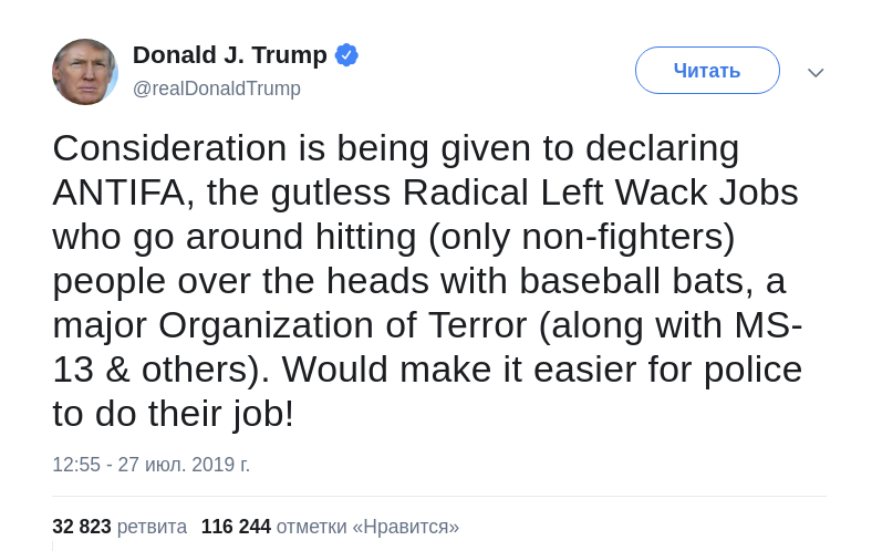 “Рассматривается вариант объявления Antifa, трусливых психов с радикальными левыми взглядами, которые разгуливают и бьют слабых по головам бейсбольными битами, крупной террористической организацией (наряду с бандой MS-13 и другими)", - отметил Трамп.
