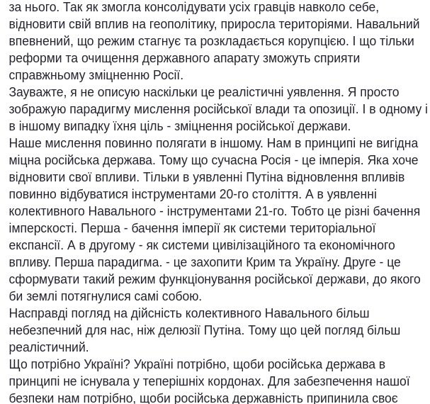 "На самом деле взгляд на действительность Навального более опасен для нас, чем взгляд Путина. Потому что Украине нужно, чтобы российское государство в принципе не существовало в нынешних границах...Чтобы освободились народы Кавказа и другие народы... Геополитическая задача Украины при этом должна заключаться в том, чтобы обеспечить интеграцию бывших территорий России в европейское пространство...
