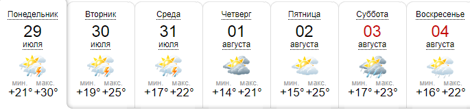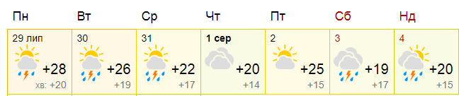 Сайт Sinoptik.ua также обещает нежаркое начало августа. В понедельник-вторник +25...+30. Вероятность грозового дождя. В среду до +22 днем - осадки. В четверг и пятницу сухо: воздух прогреется до 21...+25. На выходных, 3-4 августа, в Киеве дождь, температура +22...+23 днем.