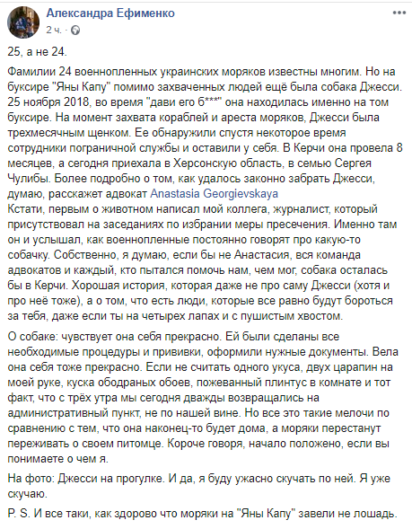 "На момент захвата кораблей и ареста моряков, Джесси была трехмесячным щенком. Ее обнаружили спустя некоторое время сотрудники пограничной службы и оставили у себя. В Керчи она провела 8 месяцев, а сегодня приехала в Херсонскую область, в семью Сергея Чулибы", - написала журналистка Александра Ефименко.