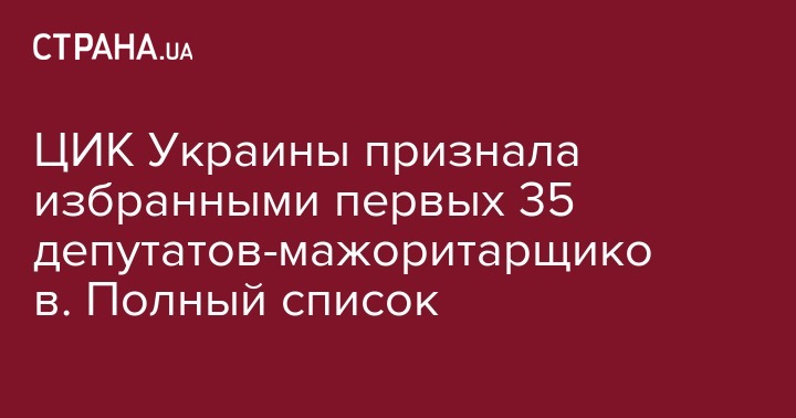 Центральная избирательная комиссия (ЦИК) признала избранными на внеочередных выборах в Верховную Раду первых 35 народных депутатов. Об этом сообщает ЦИК в понедельник на странице в Facebook.
