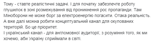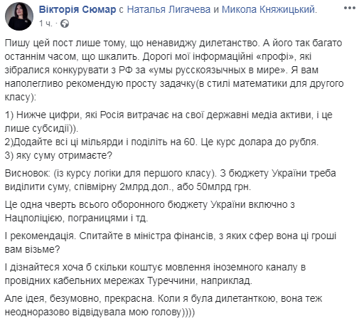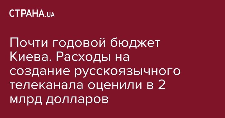 Затраты на создание всемирного русскоязычного канала из бюджета Украины оцениваются в 2 млрд долларов США (50 млрд гривен). Об этом говорится на Facebook-странице Главы комитета Рады по вопросам свободы слова и информационной политики Виктории Сюмар.