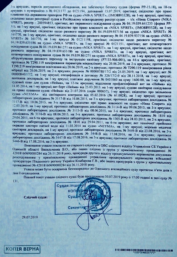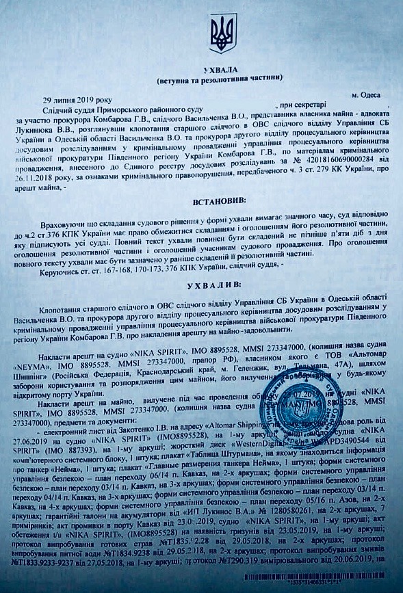 Также Анатолий Матиос отметил, что украинский суд проверил правомерность действий военных прокуроров и следователей Службы безопасности Украины, а также соблюдение ими требований закона при проведении обыска на российском танкере 25 июля.