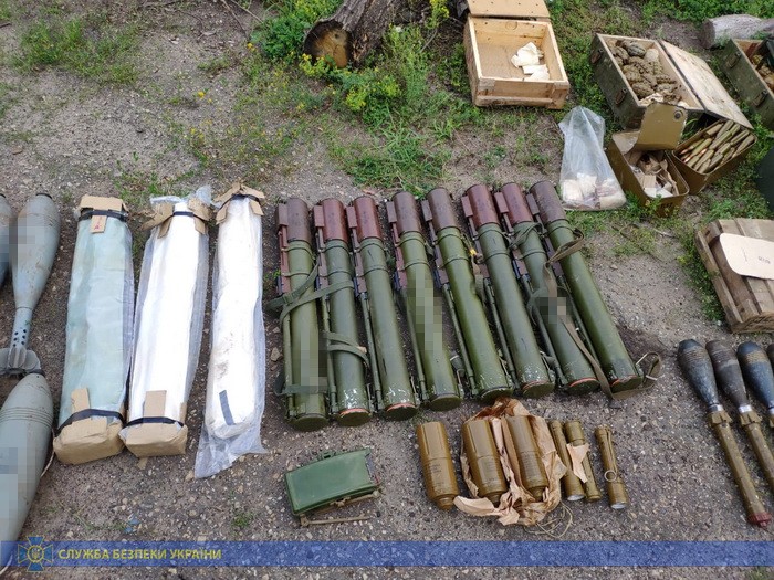 Во время обыска изъяли 16 минометных мин ОФ-36 калибра 120 мм (запрещённых Минскими соглашениями), 11 ручных противотанковых гранатометов РПГ-22, 3 ручных кумулятивных гранаты РКГ-37, 66 гранат ВОГ-17 к автоматическому гранатомету, противопехотную направленную мину МОН-50, 44 гранаты Ф-1 и РГД-5, 12 ящиков с патронами различного калибра, заряды к минам, взрыватели и самодельные взрывные устройства.