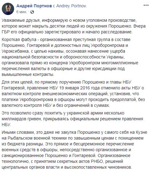 "Короткая фабула - организованная преступная группа в составе Порошенко, Гонтаревой и должностных лиц Укроборонпрома и Укрэксибанка, с целью наживы, осознавая нанесение ущерба национальной безопасности и обороноспособности Украины, организовала прямо из концерна Укроборонпром многомиллионные перечисления валюты в офшорные и другие юрисдикции под вымышленные контракты", - пишет Портнов.
