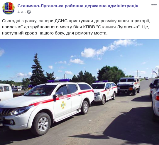 "Сегодня с утра, саперы ДСНС приступили к разминированию территории, прилегающей к разрушенному мосту у КПВВ" Станица Луганская ". Это следующий шаг с нашей стороны для ремонта моста".