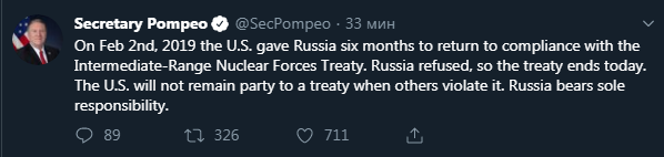"2 февраля 2019 года США дали России шесть месяцев на то, чтобы вернуться к соблюдению Договора о ликвидации ракет средней и меньшей дальности. Россия отказалась, так что договор прекращает действие сегодня. США не могут быть участником договора, когда другие его нарушают. Россия несет полную ответственность за это", - написал он.