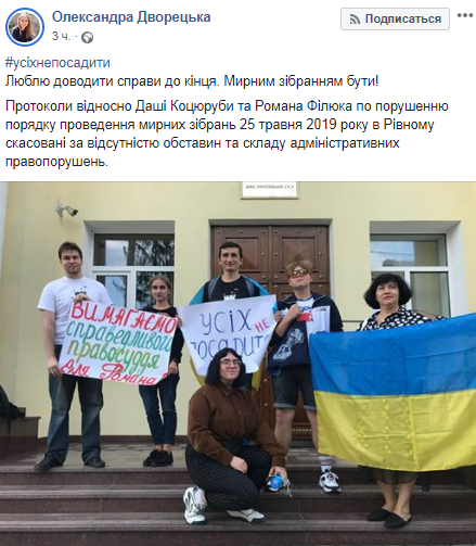 "Протоколы в отношении Даши Коцюрубы и Романа Филюка о нарушении порядка проведения мирных собраний 25 мая 2019 в Ровно отменены из-за отсутствия обстоятельств и состава административных правонарушений", - написала в Facebook правозащитница Александра Дворецкая.