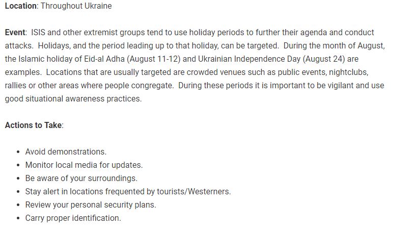 "ИГИЛ и другие экстремистские группы, как правило, используют праздничные периоды для … проведения атак. Праздники и предшествующий период могут быть целевыми. В августе – исламский праздник Курбан-байрам (11-12 августа) и День Независимости Украины (24 августа)", - сообщает посольство.