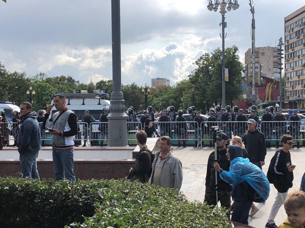 14:35 На Пречистенских воротах, где должны были собираться митингующие, на 50 человек ОМОНа 20 гражданских. Ливень закончился, но идёт дождь.