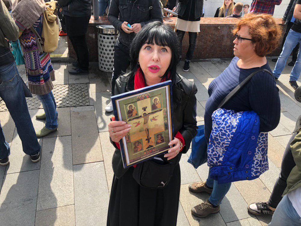 15:20 Сюда же пришел и местный крестный ход. С крестом большим и с иконами, хотели пройти вглубь, где проходят задержания, но их не пустили. Одна из женщина пришла с иконой, крестит ею ОМОН.