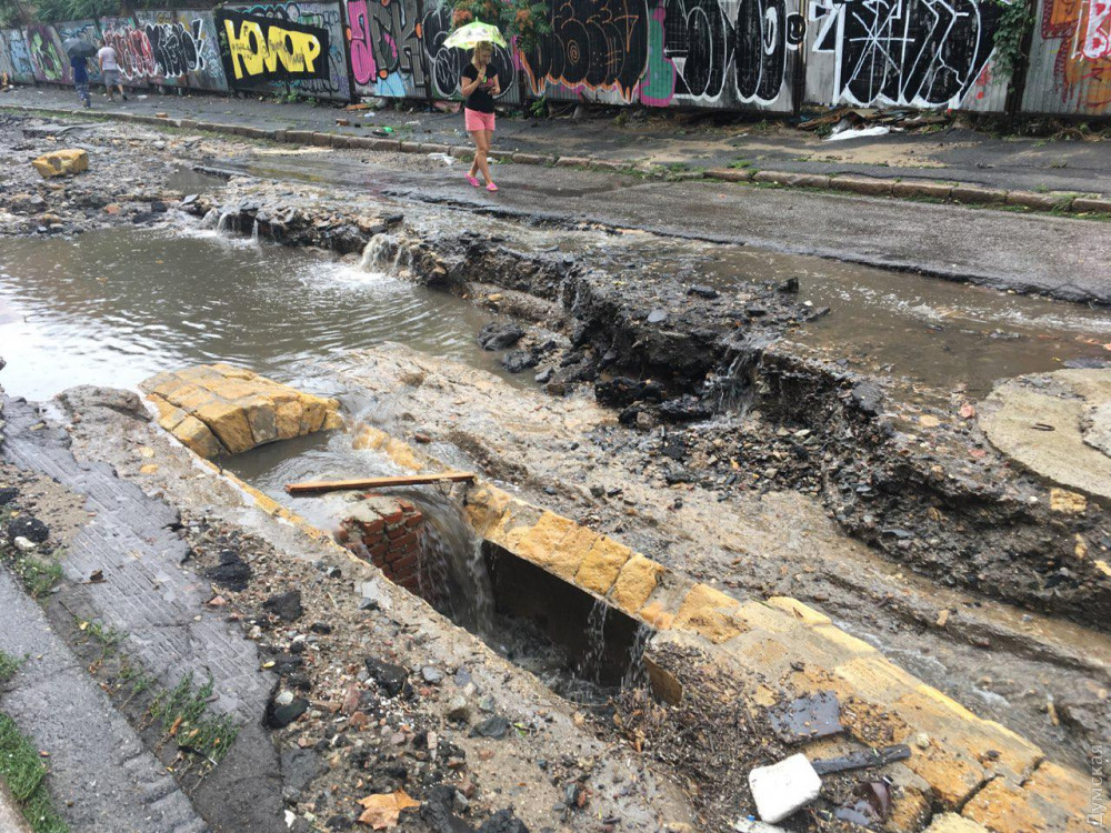 На Карантинном спуске в центре Одессы поток воды снес  припаркованные автомобили, сорвал асфальтовое покрытие и разворотил ливневый коллектор.