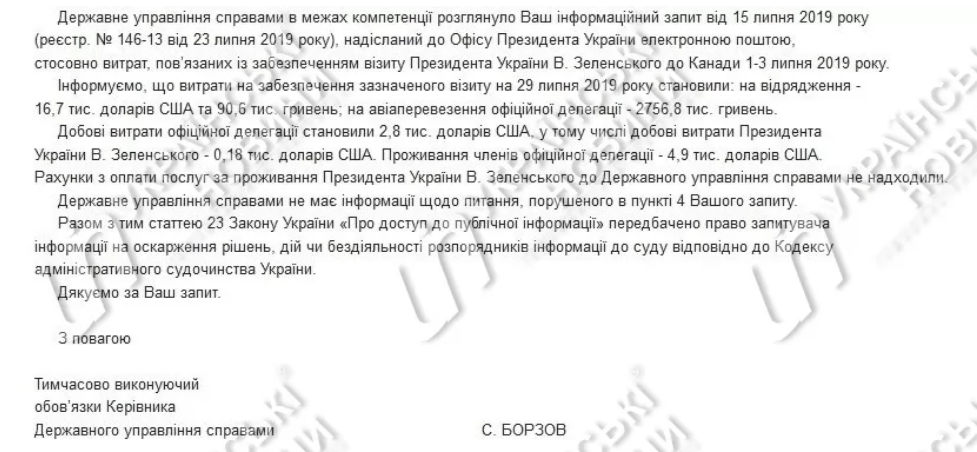 Расходы на визит президента Украины Владимира Зеленского в Канаду, который длился с 1 по 3 июля, составили 3,5 миллиона гривен. Такая сумма указана в ответе Государственного управления делами на запрос "Українських Новин".