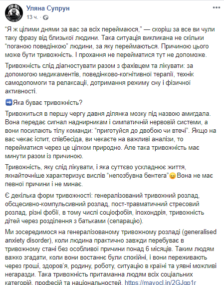"При генерализованном тревожном расстройстве (generalised anxiety disorder) человек практически всегда находится в тревожном состоянии без особой причины более 6 месяцев. Таким людям трудно вспомнить, когда они последний раз были спокойны, и они переживают из-за денег, здоровья, семьи, работы, ситуации в стране и мнимых возможных проблем. Такая тревожность присуща людям всех социальных категорий, профессий и национальностей. Тревожные люди склонны отказываться от чего-то как и хорошего: путешествий, поиска новой работы, знакомств и выступлений - потому что боятся, что станет тревожно к непереносимости", - написала Ульяна Супрун.
