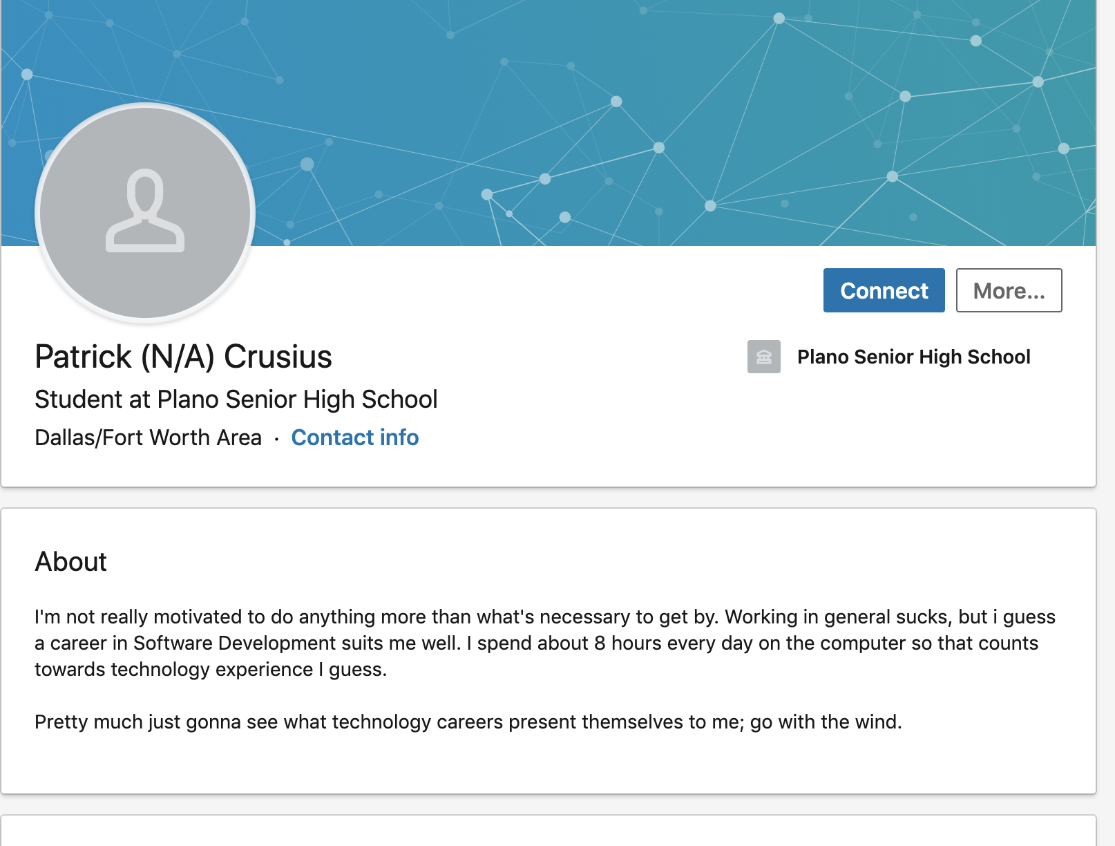 Патрик оставил некоторые следы в соцсетях. Так, в LinkedIn он писал, что не любит работать более, чем положено для того, чтобы хоть как-то жить. "Работа - это г...но", - писал Крусиус в соцсети, которая предназначена для поиска работы.