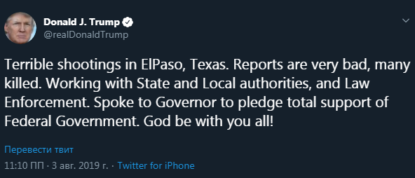 Об инциденте в своем Twitter написал президент США Дональд Трамп. "Страшные перестрелки в Эль-Пасо, штат Техас. Отчеты очень плохие, многие убиты. Работаем с государственными и местными органами власти и правоохранительными органами. Говорил с губернатором о полной поддержке федерального правительства. Бог со всеми вами", - написал президент.
