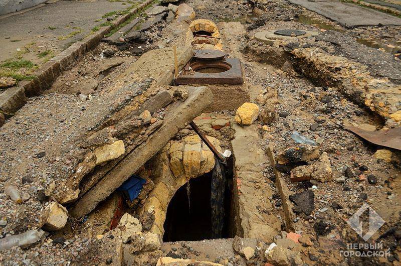 На Карантинном спуске в центре Одессы поток воды снес  припаркованные автомобили, сорвал асфальтовое покрытие и разворотил ливневый коллектор.